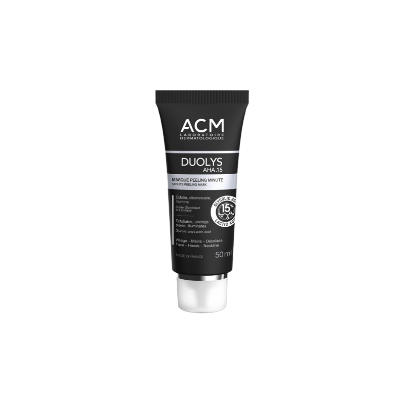 Conçu pour exfolier, désincruster et illuminer la peau, le masque peeling minute Duolys AHA 15 est un soin visage proposé par le laboratoire ACM.