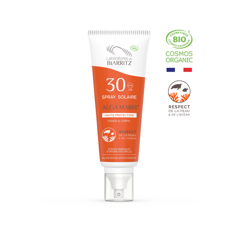 Le spray solaire SPF30+ assure une très haute protection naturelle grâce à ses écrans minéraux anti-UVA/UVB et à son extrait breveté d’algue rouge