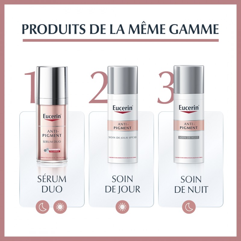 À savoir, le Sérum Éclat ANTI-PIGMENT d’Eucerin peut être combiné avec d’autres produits de la gamme ANTI-PIGMENT Eucerin, comme le Soin de Jour SPF 30 ANTI-PIGMENT.