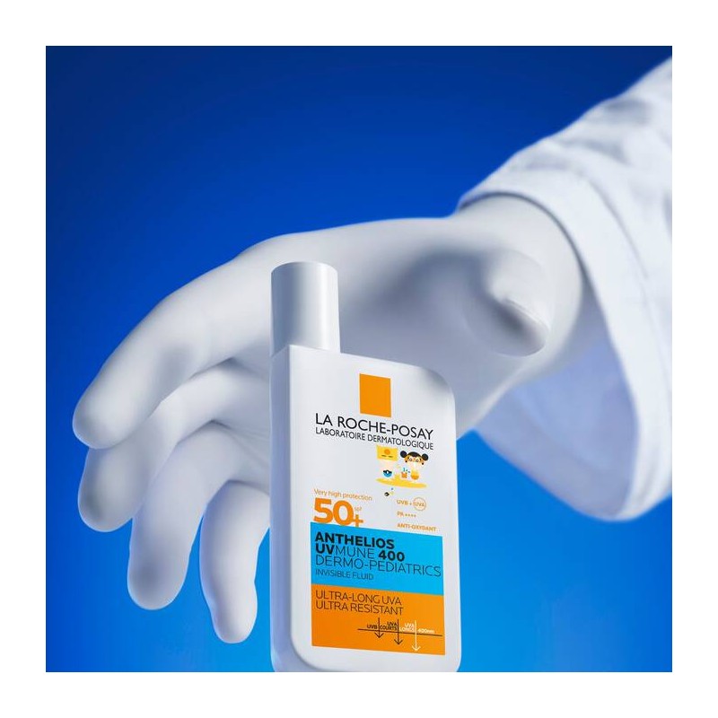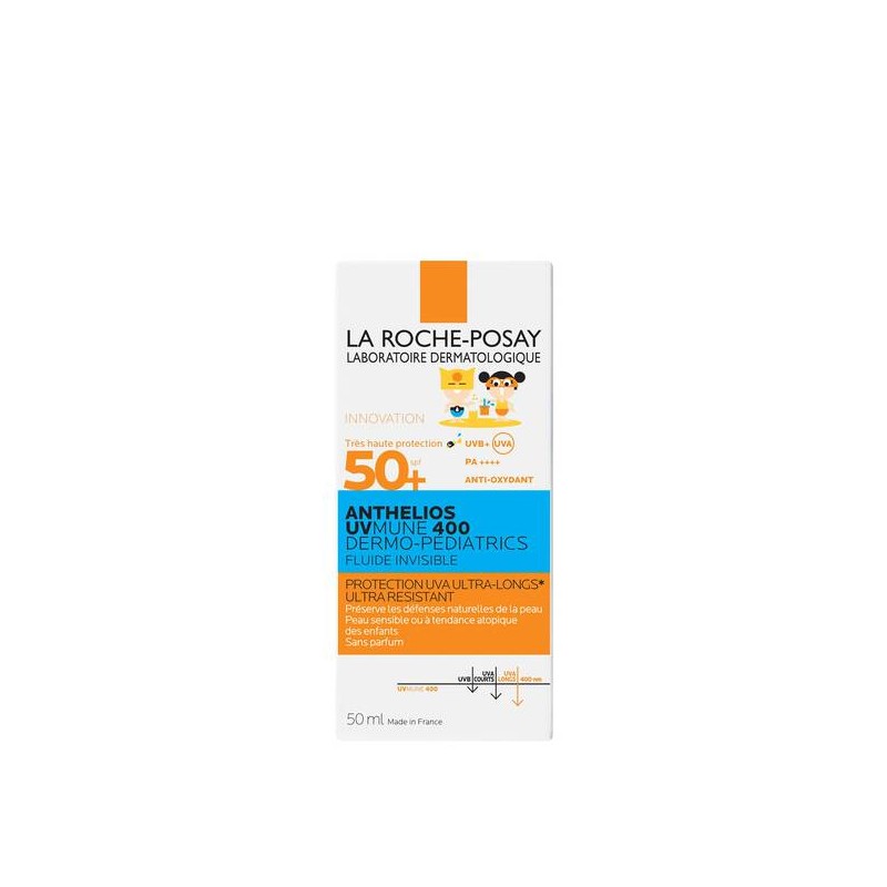 ANTHELIOS UV MUNE 400 Dermo-Pediatrics fluide solaire très haute protection à large spectre contre les UVA/UVB & UVA ultra-longs. Très résistant à l’eau, au sable et à la transpiration. Sans parfum, texture légère.