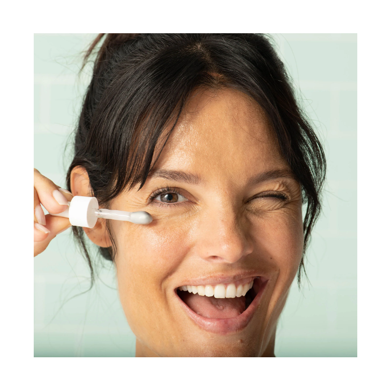 Prélever une petite quantité de sérum avec la pipette, appliquer sur le contour de l’œil non irrité, puis masser avec l’embout métallique. Vous pouvez terminer le geste avec le bout des doigts pour finir de faire pénétrer le soin. Ne pas appliquer dans l’œil.