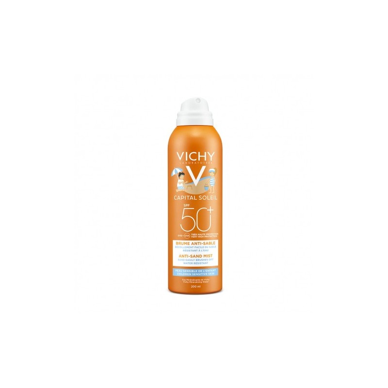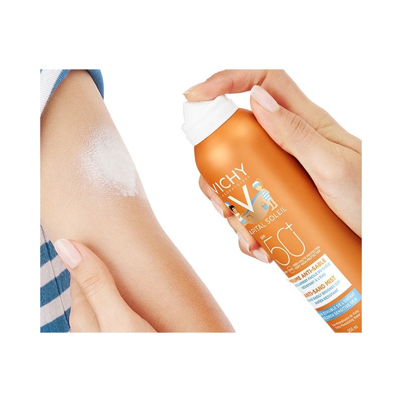Grâce à sa formule conçue spécialement pour la peau délicate des tout-petits, Vichy Brume Anti-Sable enfants SPF 50+ propose plusieurs actions pour une protection optimale :