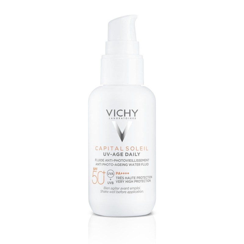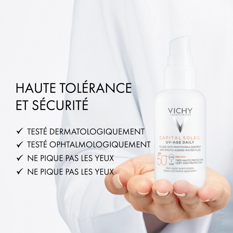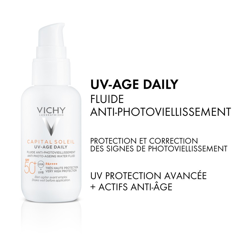 UV Age Daily SPF50+ CAPITAL SOLEIL est une crème solaire visage SPF50+ qui offre une protection avancée contre les rayons UVA et UVB grâce à sa technologie multi-brevetée Netlock.