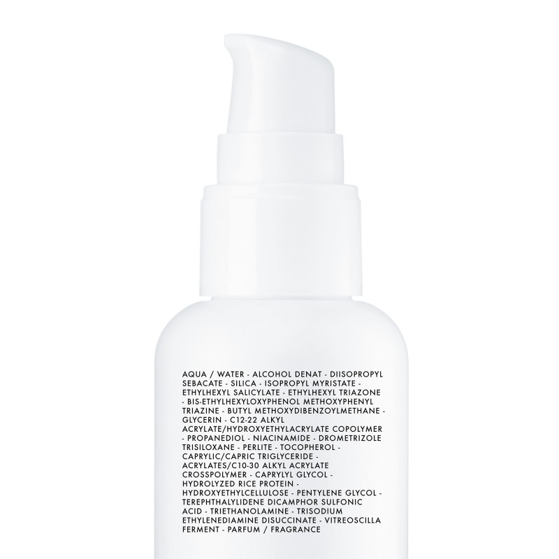 AQUA / WATER – ALCOHOL DENAT – DIISOPROPYL SEBACATE – SILICA – ISOPROPYL MYRISTATE – ETHYLHEXYL SALICYLATE – ETHYLHEXYL TRIAZONE – BIS-ETHYLHEXYLOXYPHENOL METHOXYPHENYL TRIAZINE – BUTYL METHOXYDIBENZOYLMETHANE – GLYCERIN – C12-22 ALKYL ACRYLATE/HYDROXYETHYLACRYLATE COPOLYMER – PROPANEDIOL – NIACINAMIDE – DROMETRIZOLE TRISILOXANE – PERLITE – TOCOPHEROL – CAPRYLIC/CAPRIC TRIGLYCERIDE – ACRYLATES/C10-30 ALKYL ACRYLATE CROSSPOLYMER – CAPRYLYL GLYCOL – HYDROLYZED RICE PROTEIN – HYDROXYETHYLCELLULOSE – PENTYLENE GLYCOL – TEREPHTHALYLIDENE DICAMPHOR SULFONIC ACID – TRIETHANOLAMINE – TRISODIUM ETHYLENEDIAMINE DISUCCINATE – VITREOSCILLA FERMENT – PARFUM / FRAGRANCE